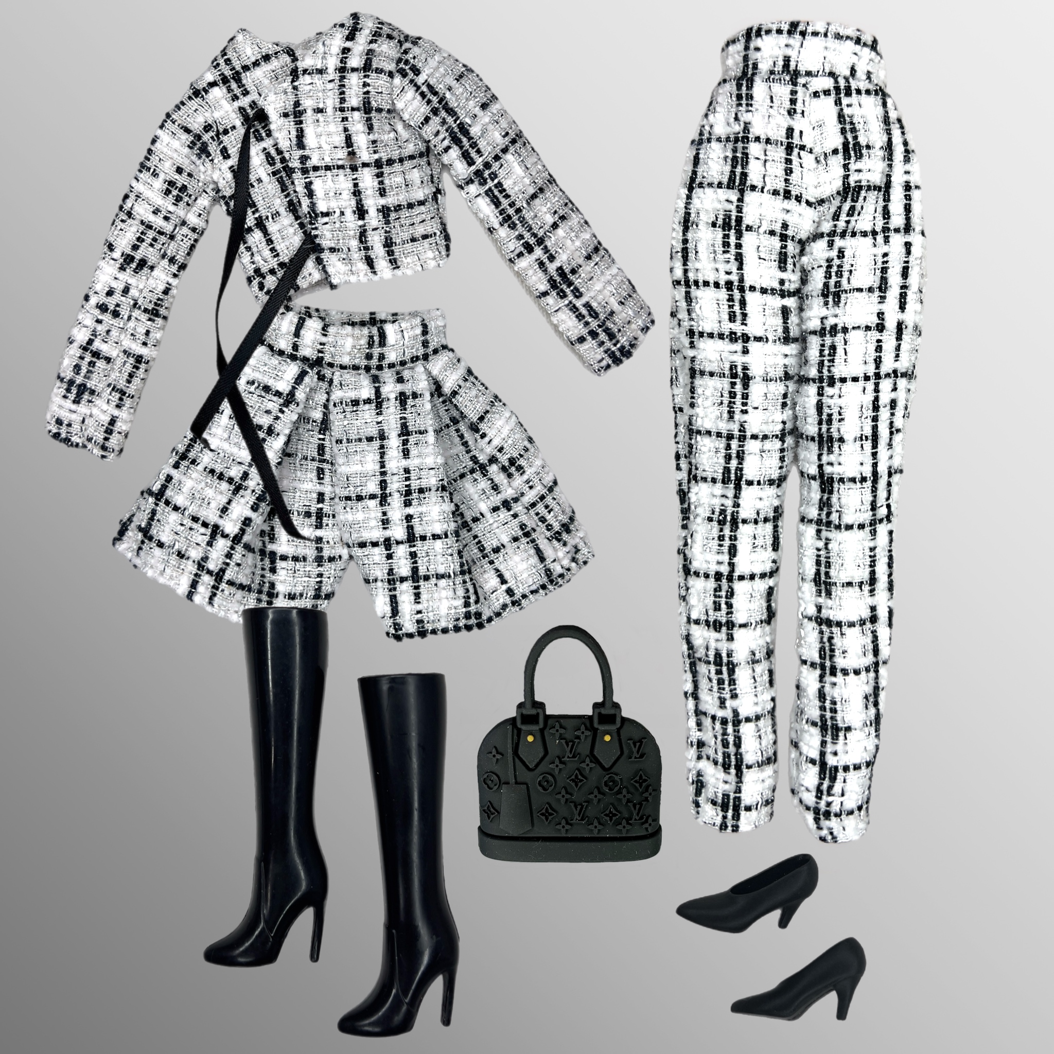 Eledoll Clothes Fashion Pack for 12 inch Doll Tweed Plaid Black & White Pants Suit Set